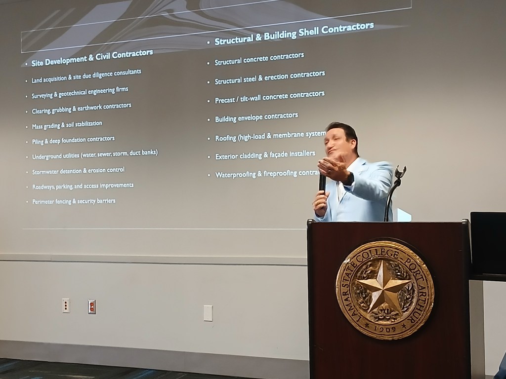 The Chamber’s meeting at the Carl A. Parker Multipurpose Center highlighted the importance of local and regional firms preparing to compete for significant work associated with this project. “It reflects Southeast Texas industrial realities– high electrical demand, coastal conditions, hurricane resilience, and a strong, skilled-craft workforce,” stated Joe Tant, president of the Greater Port Arthur Chamber of Commerce.