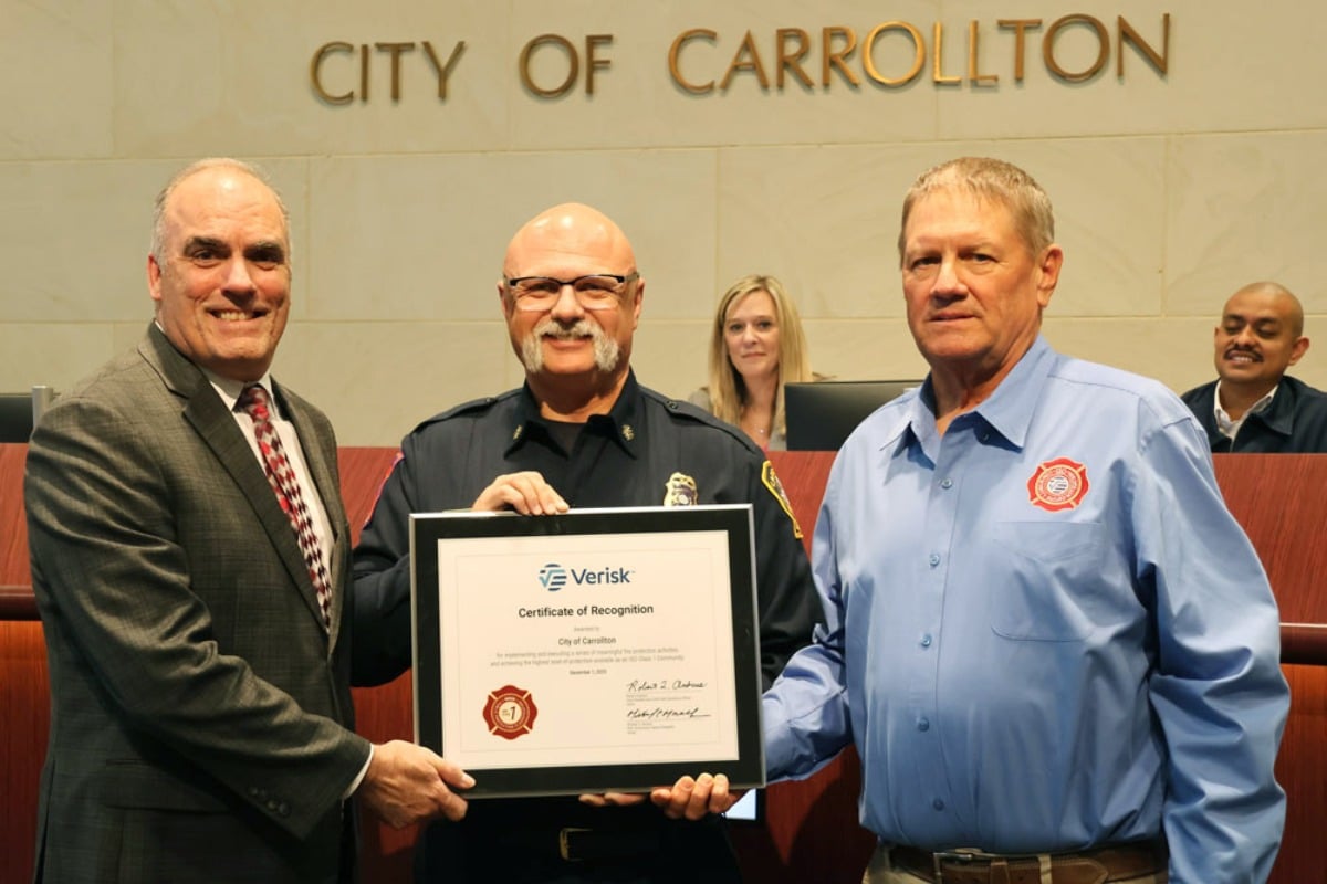 With the continued Class 1 rating becoming effective on December 1, 2025, residents can expect to see the financial benefits reflected in their personal and commercial property insurance rates. This achievement was celebrated during a City Council meeting on December 2, where Mayor Steve Babick and Fire Rescue Chief Michael Thomson received plaques from the ISO and the State Fire Marshal’s Office.