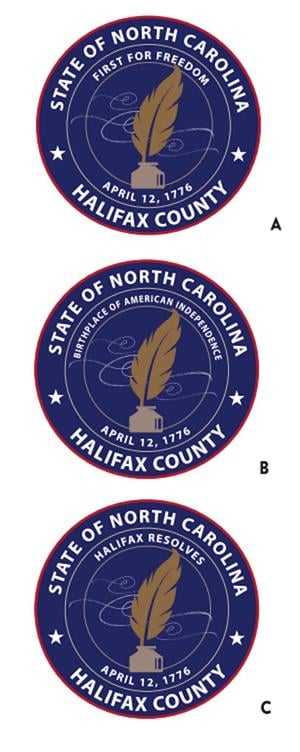 The Board reviewed three new options designed by Bizzell Design Inc.. These designs include a circular border featuring the state name at the top and the county name at the bottom, with a quill and inkwell symbolizing the drafting of the Halifax Resolves. The options present varying phrases: “First for Freedom,” “Birthplace of American Independence,” and “Halifax Resolves.”
