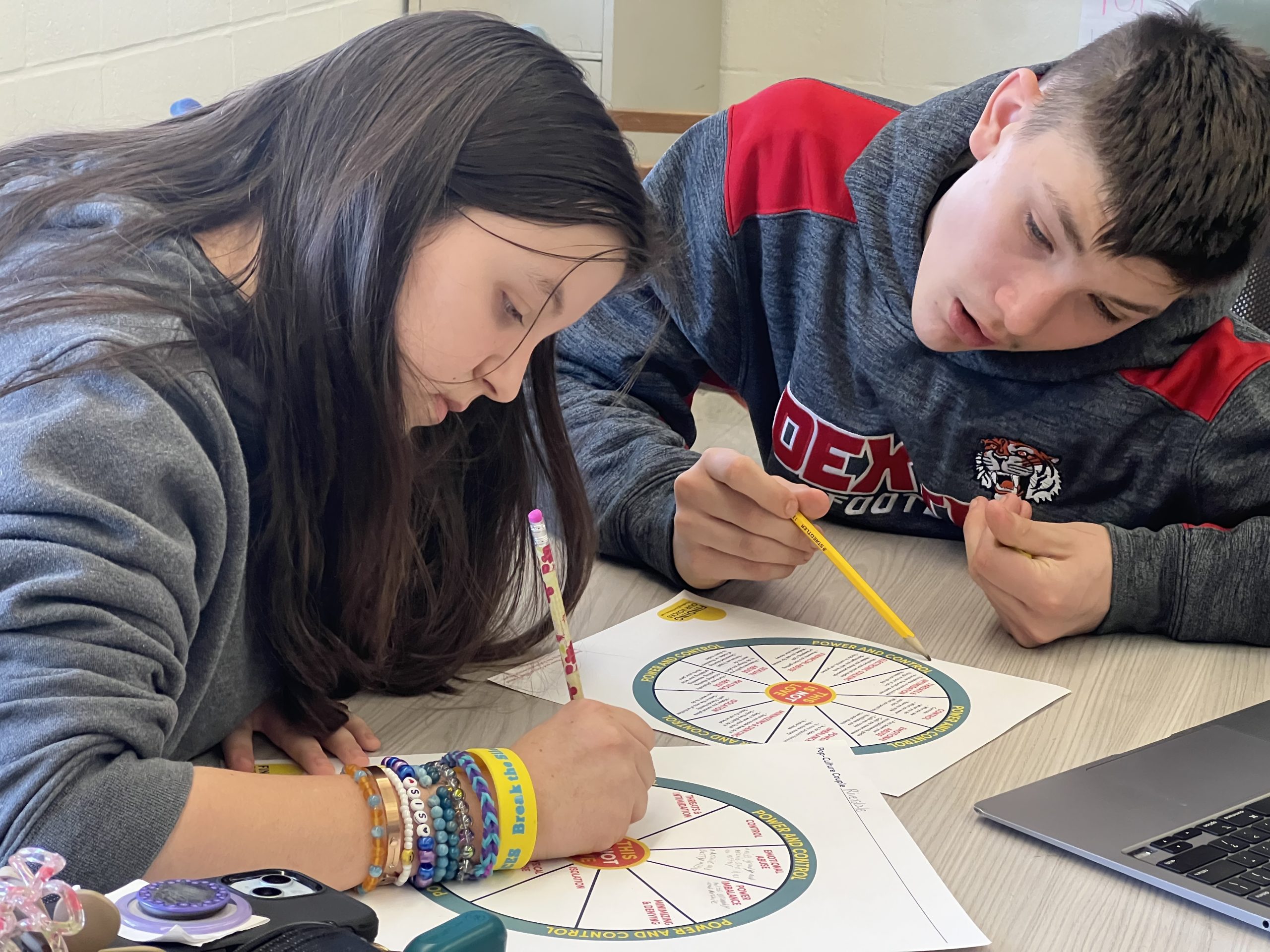 The program’s cornerstone is a hands-on project where students analyze pop culture couples to identify unhealthy relationship dynamics using an adaptation of the Power and Control Wheel. This engaging approach has allowed students to see the real-life implications of toxic relationships. The curriculum, which aligns with Maine standards, consists of three class periods designed to prepare students for the program’s visit.