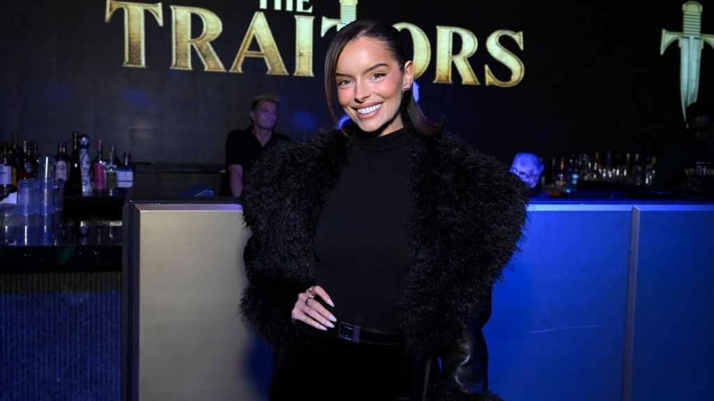 In the photo, Higgins opts for a sleek look with a fitted black base layer, topped off by an oversized black leather coat with plush trim. Her pointed black heels with gold toe caps sharpen her silhouette, while a structured black handbag with gold hardware adds a touch of elegance.