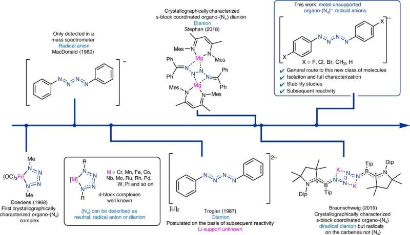 In this notable research endeavor, the team isolated five crystalline molecules featuring unsupported tetra-nitrogen radical anion ({N4}•−) chains. This was accomplished by reducing para-substituted phenyl azides with potassium graphite, a process that enabled the stabilization of the nitrogen chains under ambient conditions. One specific derivative, identified as [(4-BrC6H4)2N4]•−, demonstrated remarkable longevity, remaining stable for six weeks when stored under anaerobic conditions.