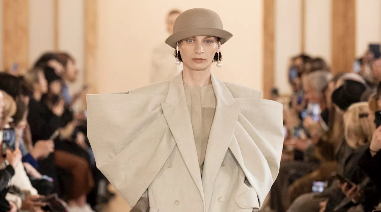 Among the standout pieces were cropped jackets with blousy backs paired with high-waisted carrot pants, and oversized suits that incorporated tucks and darts to enhance the feminine silhouette. Wang’s designs cleverly referenced architectural elements, with square and rectangular sleeve patterns inspired by the features of nearby buildings, resulting in a soft yet structured aesthetic.