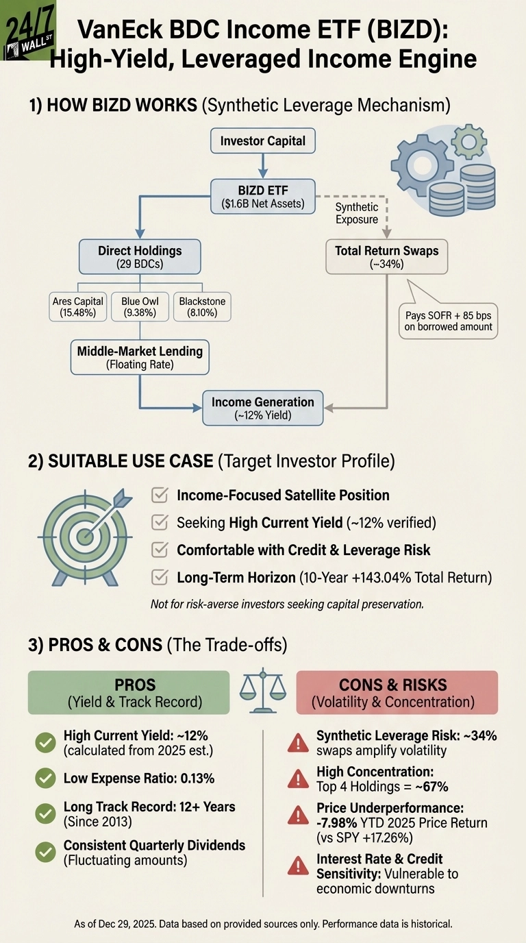 In summary, while BIZD delivers on its promise of a 12% yield, it requires investors to accept substantial risks related to leverage, concentration, and price volatility in exchange for that income.