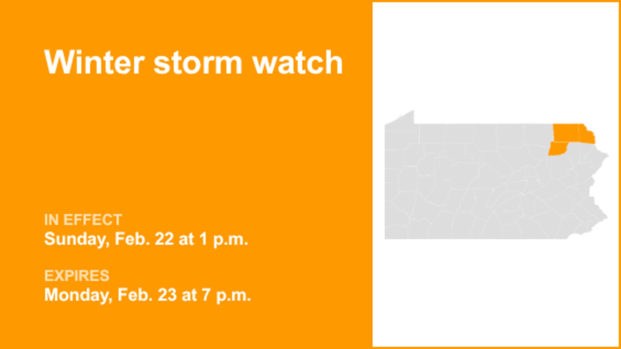 UPDATE: A winter storm watch has been issued for parts of Northeast Pennsylvania as heavy snow is expected to impact travel this weekend. The National Weather Service confirmed the watch will be in effect from January 14, 2024, at 1 p.m. until January 15, 2024, at 7 p.m., affecting Northern Wayne County, Susquehanna County, and Wyoming County.